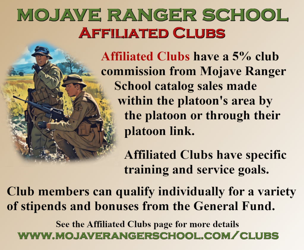 The 5 Mojave Ranger Troops, 1st SFG MIKE Force and OpFor serve as the models for the Ranger Training Clubs. Ranger Training Clubs have a club commission from any sales from the Mojave Ranger School catalog, made within the Team’s area by the Team or through their Team link. Club members can qualify individually for a variety of stipends and bonuses from the General Fund. Ranger Training Clubs have specific training and service goals.