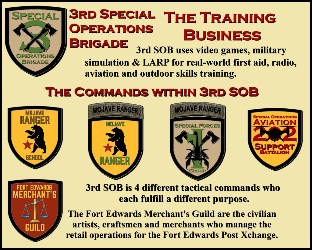 The Game is managed by the 3rd Special Operations Brigade, a family-friendly Fallout-themed airsoft/milsim club that uses video games, tabletop RPG’s and Live Action Role Play to teach first aid, radio, aviation and outdoor skills in an immersive military simulation environment at a small fort in the Mojave Desert.