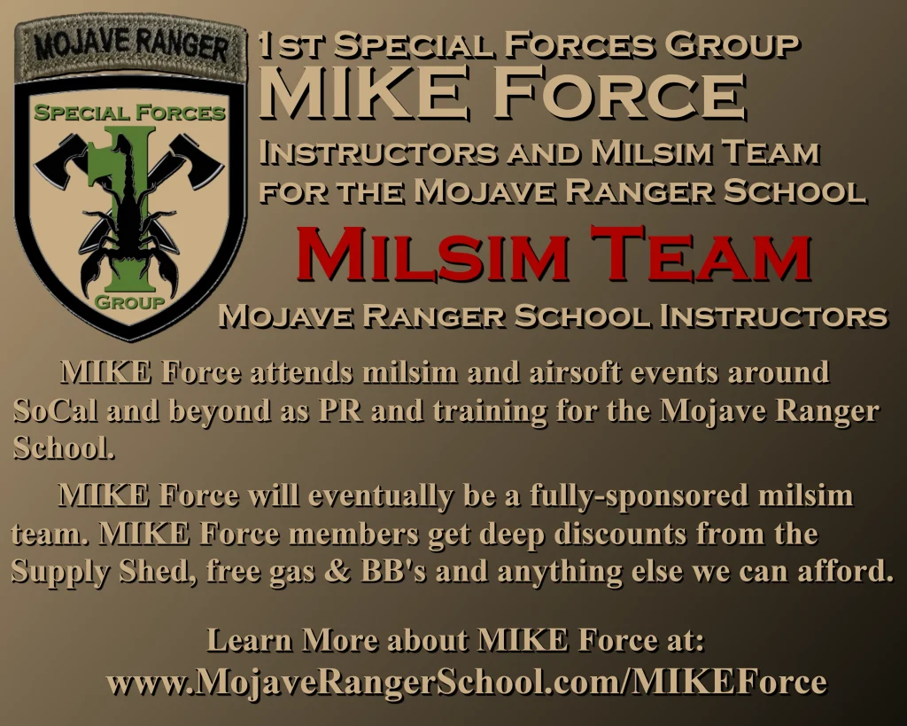 At the ultimate level the Mojave Rangers game is 2 properly-trained and paid groups of contractors (MIKE Force v. OpFor) running their own operations against each other in a persistent, immersive milsim campaign based at Fort Edwards, which is about 14 miles from Edwards AFB in the CA desert.
