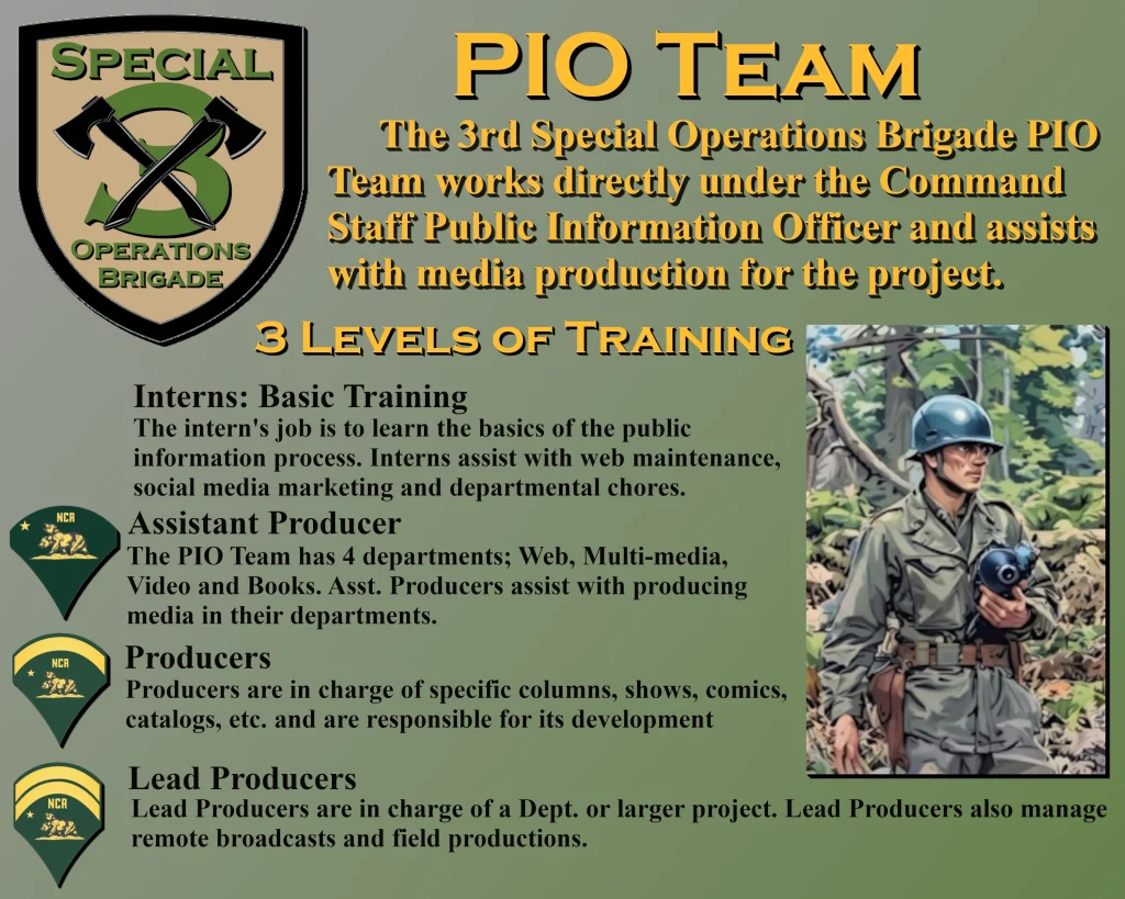 The 3rd SOB PIO Team works directly under the Command Staff Public Information Officer and assists with media production for the project.